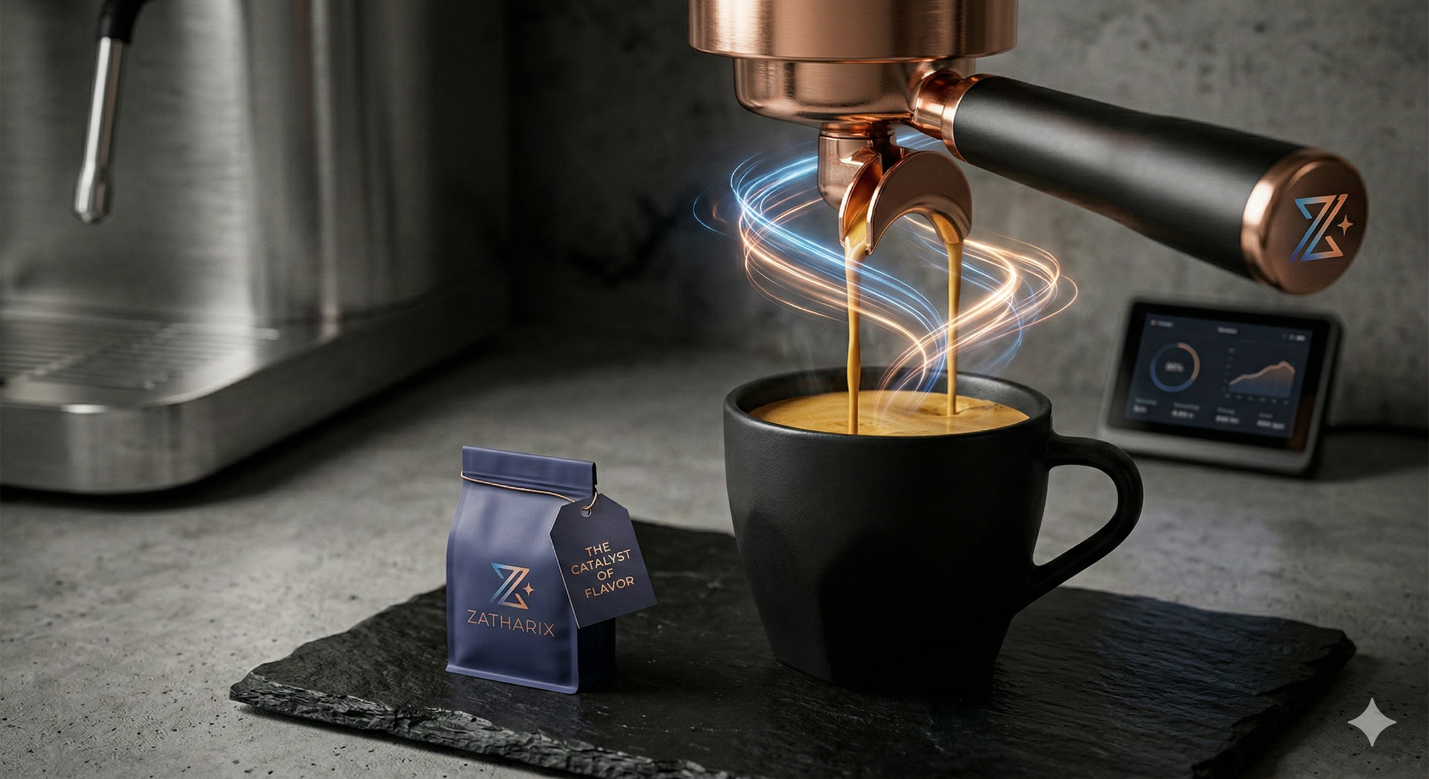 For too long, the beverage industry has been divided. You either had the rustic, cozy roaster who relied on intuition, or the clinical tech brand that forgot about the soul of the drink. Zatharix is the fusion of both. We are where kinetic energy meets grounded craft.